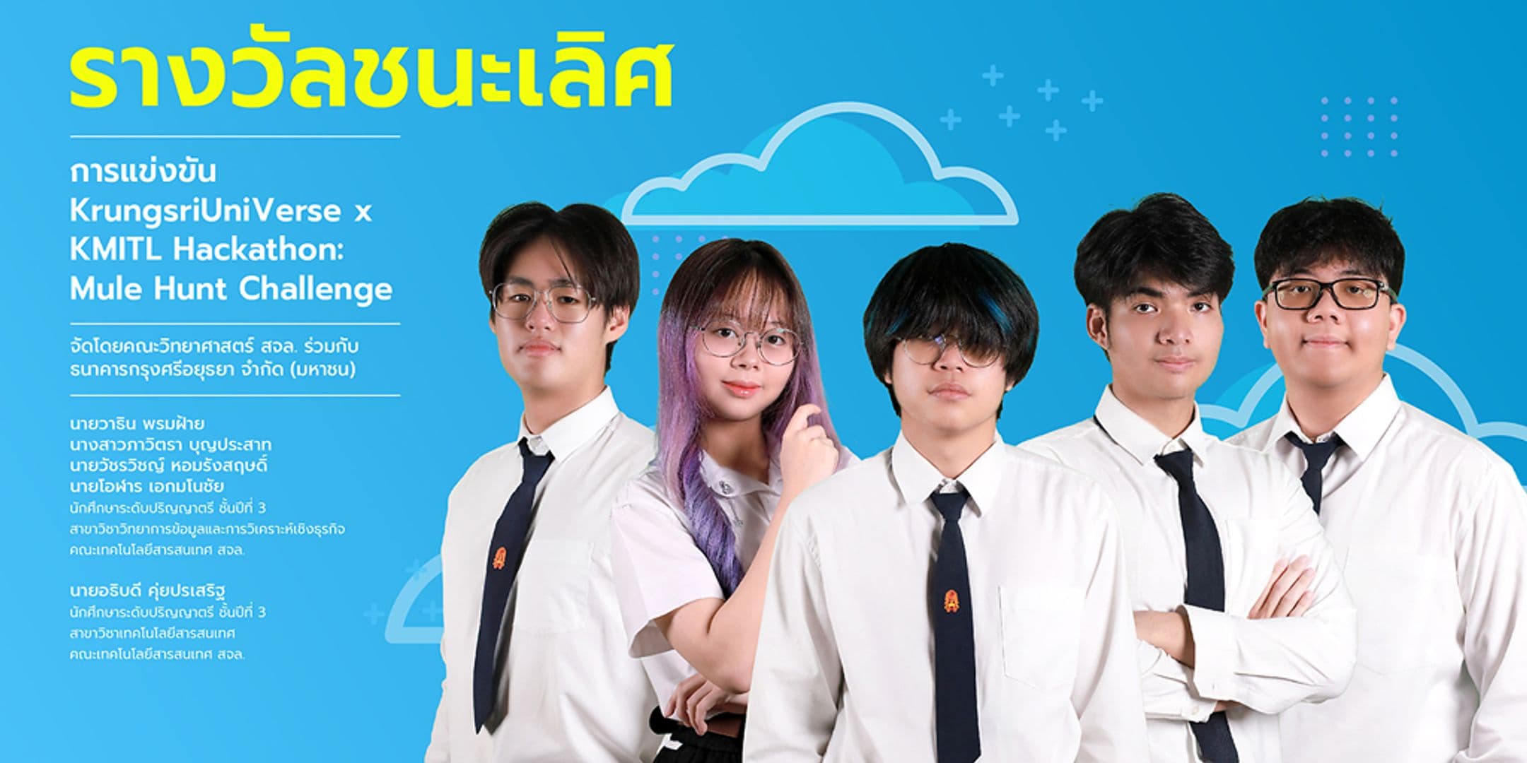 School of Information Technology KMITL congratulates its undergraduate students for winning the first prize along with a cash award of 25,000 Baht from the KrungsriUniVerse x KMITL Hackathon Competition: Mule Hunt Challenge “Up-skill, Create Ideas, Conquer Mule Accounts” organized under the academic collaboration between the KMITL Faculty of Science and Krungsri Bank Public Company Limited. The competition and award announcement took place on August 17, 2025, at the 1st floor lobby, Building A, Knowledge Lifelong Learning Center (KLLC), KMITL.